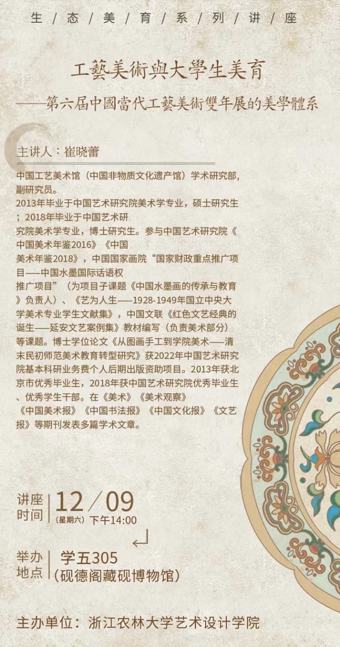 藝術設計學院堅持生態育人的理念,重視培養學生的傳統文化和思想審美的內在精神。自2020年以來,學院連續四年舉辦了“生態美育”大講堂系列活動。該活動已邀請了眾多國內外學者專家為學生舉辦了近20場講座。講座主題涵蓋傳統藝術、文化生態、思政美育等方面,通過開啟第二課堂的形式,幫助學生更好地理解和欣賞藝術和文化。如校友葉劍鴻的講座《精石墨化 生態與人》從硯文化的視角闡釋了中國文化的博大精深,浙大教授付俊的《讀畫——宋畫中的鄉村》則解讀了宋韻文化,從繪畫中解讀宋人的生活和情懷。