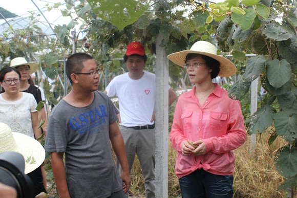 周艷一行來到諸暨市陳宅鎮(zhèn)棠里塢紅心獼猴桃基地?;刎撠熑擞崦骶翘炷繉W院2009屆畢業(yè)生,大學畢業(yè)后選擇投身現(xiàn)代農(nóng)業(yè)創(chuàng)業(yè),目前共種植標準化獼猴桃150畝。周艷一行仔細查看受災果園,詳細詢問受災情況。俞明均表示在相關部門和農(nóng)技專家的關心指導下,在母校大學生志愿者的幫助下,組織生產(chǎn)救援,全力抗旱保果。