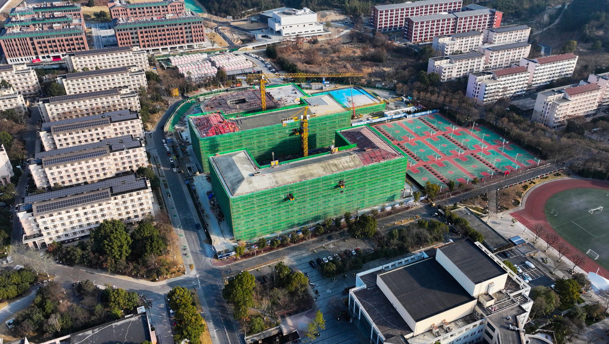 在施工現場,盡管在校生們已放寒假,但本該日漸冷清的浙江農林大學校園里,依然熱火朝天。兩幢6層高的學生宿舍樓、學習中心、食堂里,近百名建筑工人正加班加點,忙得不亦說乎,塔吊、臂架式混凝土泵車加足馬力,完成最后的工作。隨著主體結構順利結頂,項目的建設重點,開始轉到內部砌體及二次結構施工、室內外裝飾裝修。同時,屋面電梯,電氣、消防、弱電等工程等也將陸續開展,相關參建單位將進一步齊心協力、嚴把安全關、質量關,確保進度,按計劃投入使用。