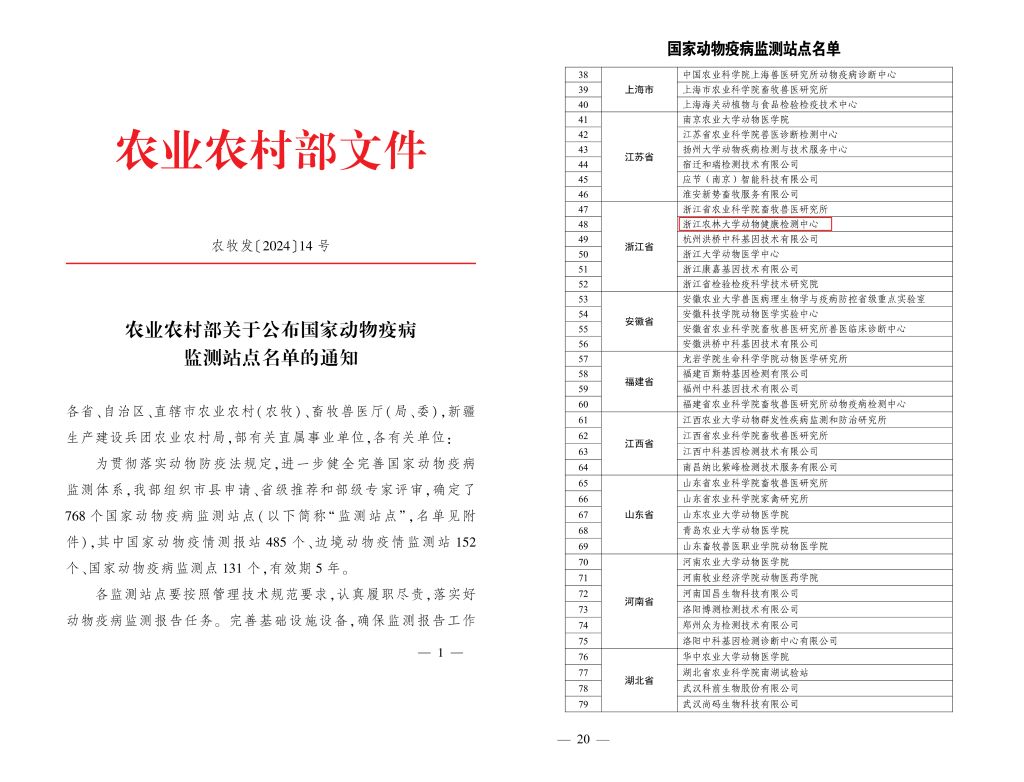 近日,農業農村部公布了國家動物疫病監測站點名單,浙江農林大學動物健康檢測中心成功入選。