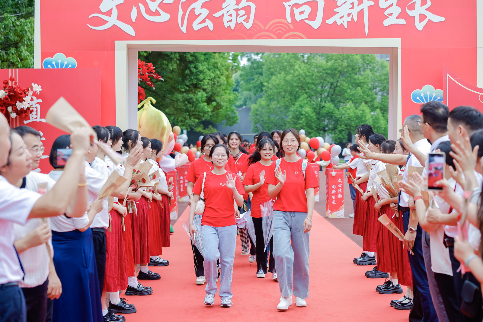 典禮開始之前,老師和同學們依次走過紅毯。高年級學生通過獻花表達了對恩師教導的感激之情,完成了感恩禮。