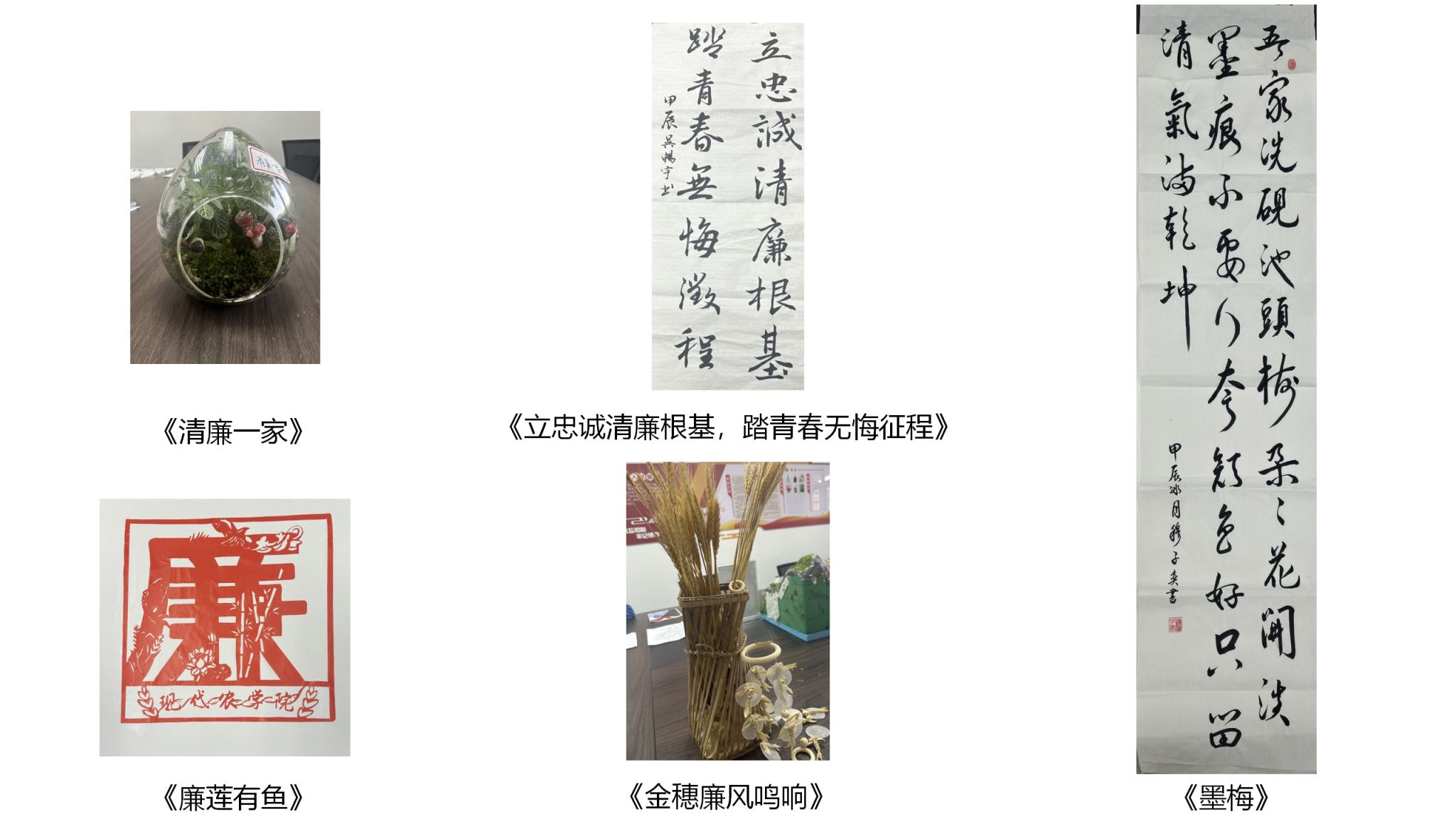 本次大賽以“清風揚正氣,廉潔促發展”為主題,鼓勵廣大同學立足農學院實際,結合學科專業特色,深入挖掘作物、植物、昆蟲等的廉潔文化元素,講述身邊的廉潔故事,宣傳廉潔理念,傳播廉潔文化。共收到手工、海報、征文、書法等各類作品30余件。最終評選出特等獎1名、一等獎5名、二等獎10名、三等獎12名。