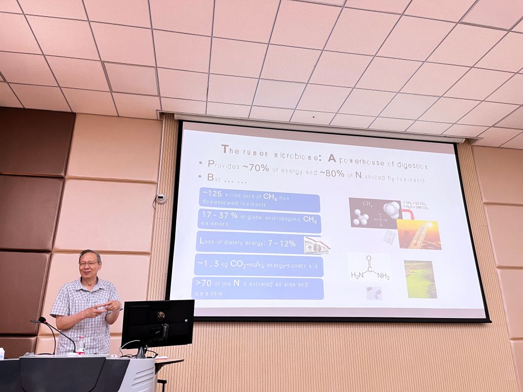 報(bào)告上,于忠堂匯報(bào)了團(tuán)隊(duì)近期在菌群移植、瘤胃原蟲(chóng)和瘤胃病毒組的前沿性研究。對(duì)于菌群移植,他認(rèn)為應(yīng)該有目的性的選擇供體,并提出要開(kāi)展長(zhǎng)期影響的研究;對(duì)于瘤胃原蟲(chóng),于教授指出靶向抑制特異的瘤胃原蟲(chóng)是降低瘤胃內(nèi)蛋白循環(huán)的潛在路徑。于忠堂強(qiáng)調(diào),控制如內(nèi)毛屬原蟲(chóng)、甲烷短桿菌、高血氨生成菌以及鏈球菌等“有害”菌和其寄生的噬菌體及噬菌體產(chǎn)物對(duì)瘤胃的調(diào)控至關(guān)重要。此次報(bào)告帶來(lái)了相關(guān)研究領(lǐng)域的前沿研究動(dòng)態(tài),極大拓寬了廣大師生的學(xué)術(shù)視野。